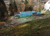 Na pozemku je vybudovaná základová železobetónová doska budúcej stavby drevodomu s čiastočnými pivničnými