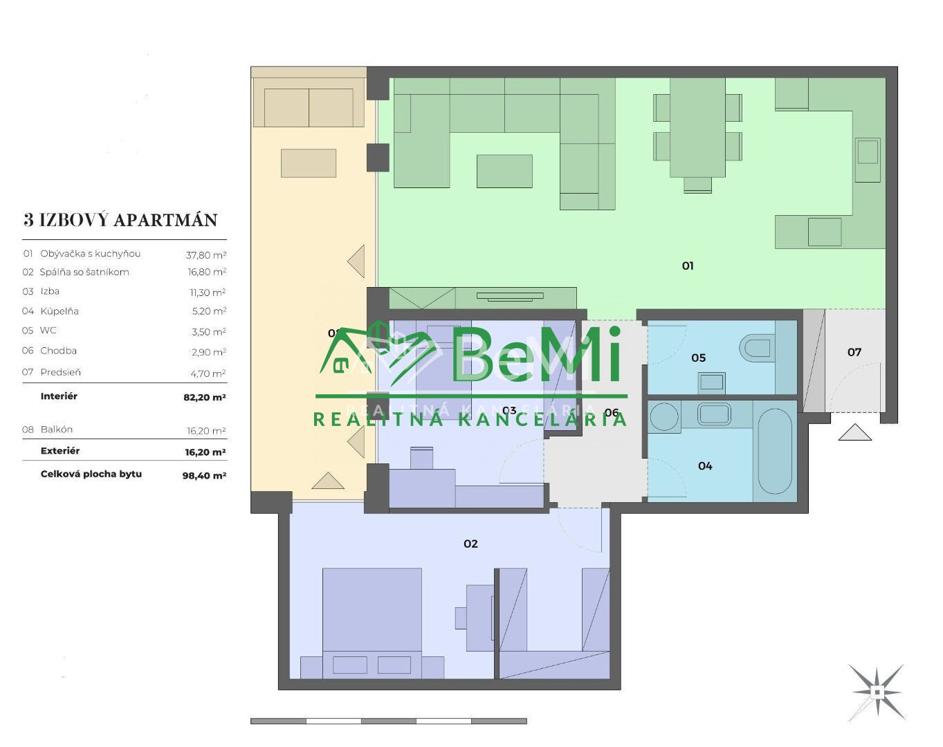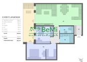 Dispozícia: predsieň, kuchyňa s jedálňou, prepojená s obývacou izbou, spálňa so šatníkom, izba, kúpeľňa, samostatné WC, veľký balkón prístupný zo všetkých izieb.