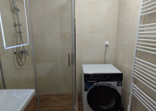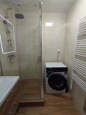 kúpeľňa so sprchovým kútom, umývadlom a novou práčkou