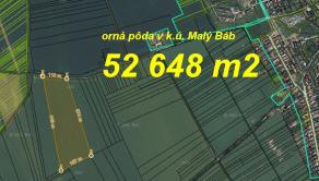 Na predaj orná pôda v k.ú. Malý Báb o výmere až 52 648 m2. Ucelený pozemok – rozmery viď foto v galérii...Jeden majiteľ...