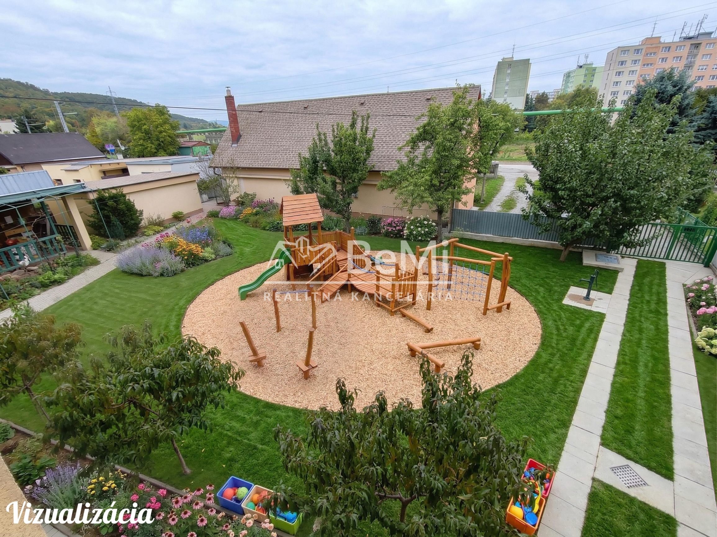 Pozemok pred domom využiteľný na parkovanie alebo detské ihrisko.