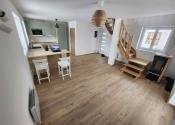 Spodné podlažie tvorí vstupná chodba, kuchyňa spojená s obývacou izbou, a technická miestnosť s WC a umývadlom. Z obývacej izby je prístup na terasu, ktorá je vybavená prívodom vody, a elektriny a pripojením na odpad, a je pripravená na úpravu na zimnú záhradu, prípadne montáž vírivky či sauny.