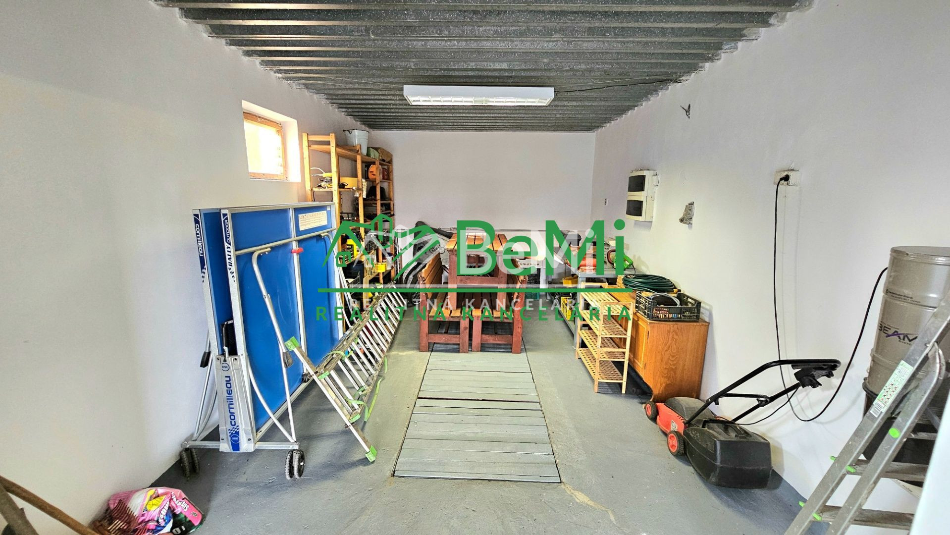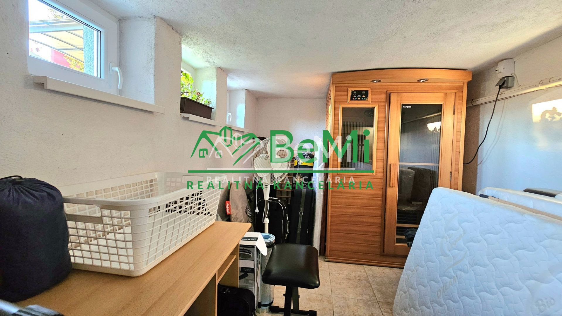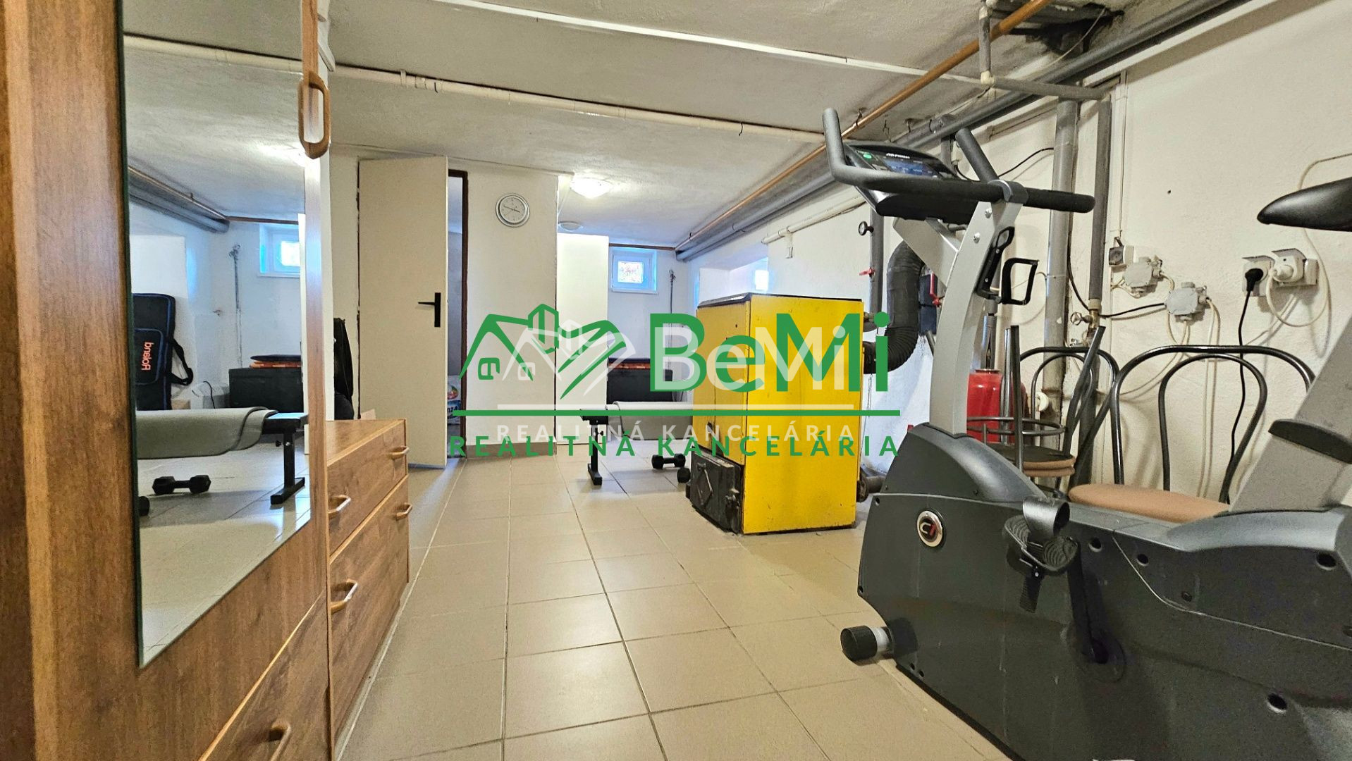 Suterén je vydláždený keramickou dlažbou a pozostáva zo špajze a z jednej veľkej miestnosti tvaru-L v ktorej sa nachádza technická časť, časť využívaná na posilňovanie a časť s infra saunou pre 2 osoby.