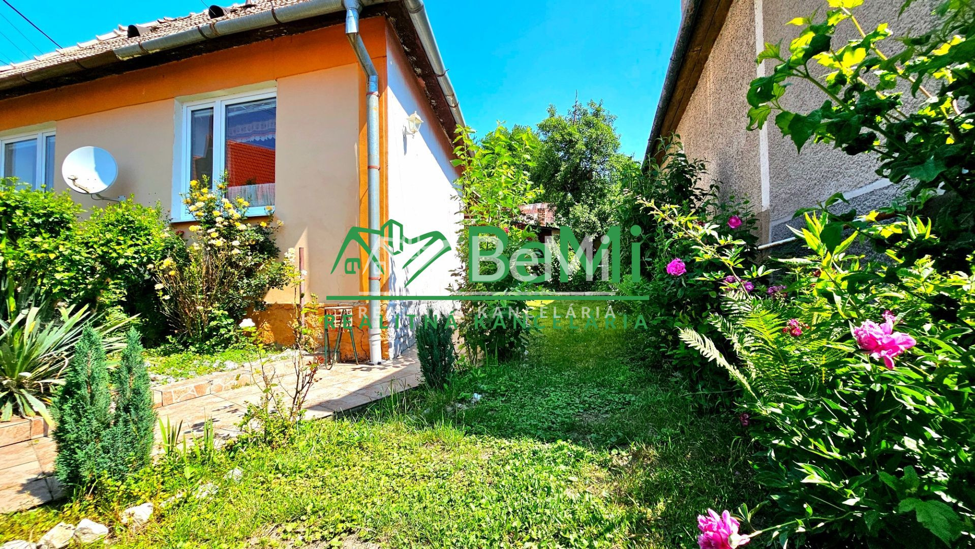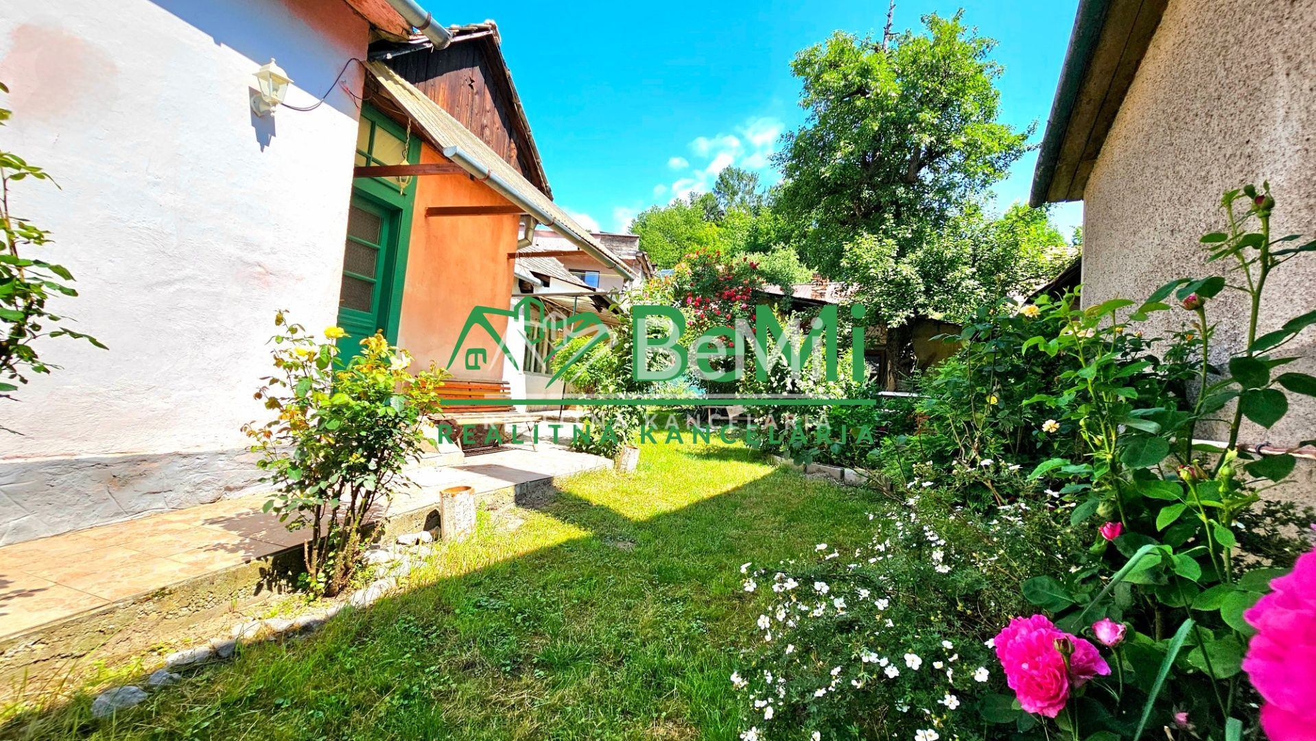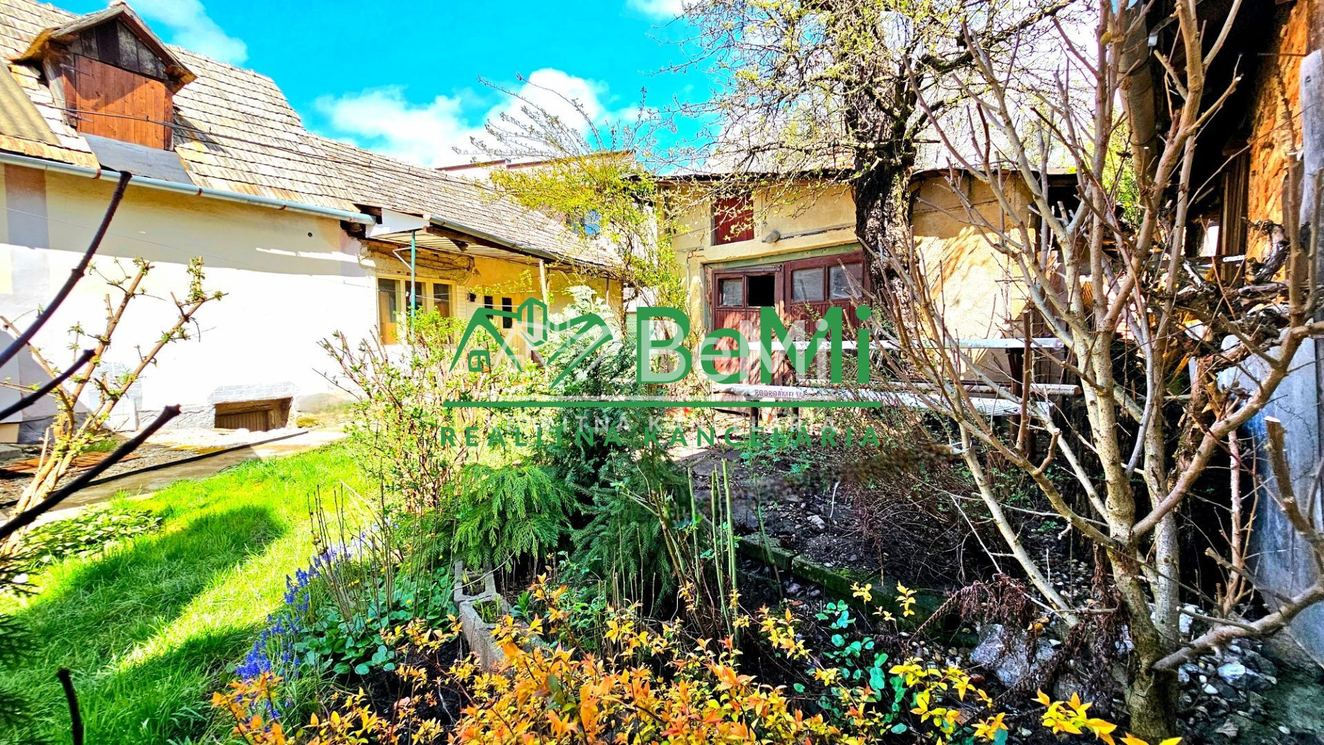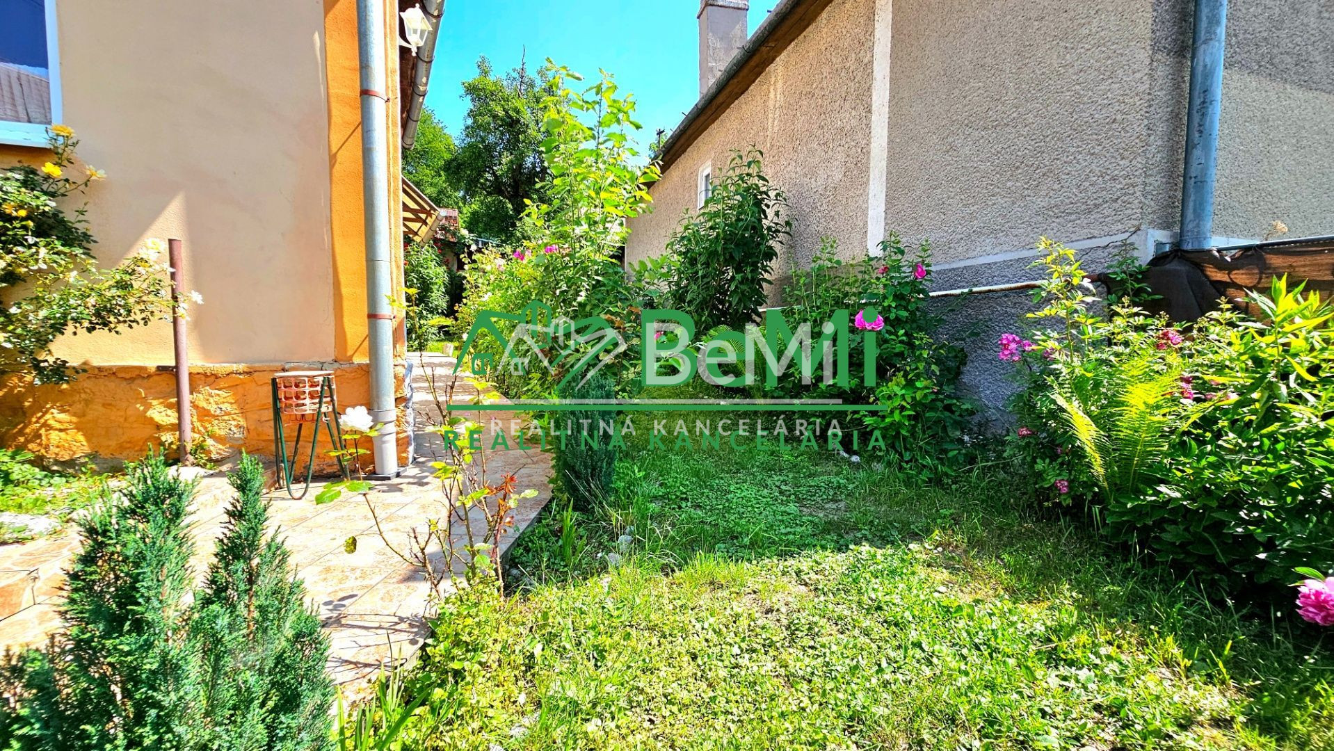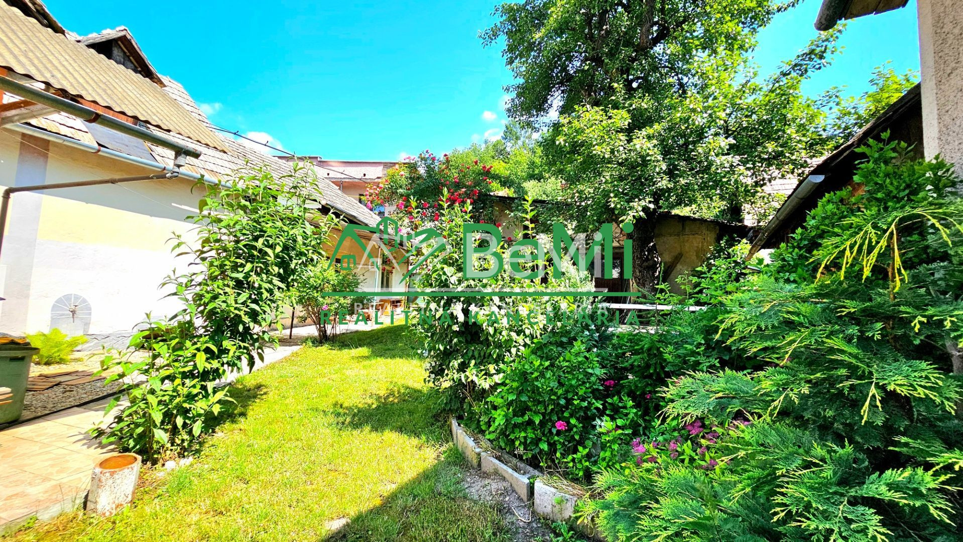 Nádvorie a predzáhradku domu tvoria okrasné rastliny a ovocný strom moruša.