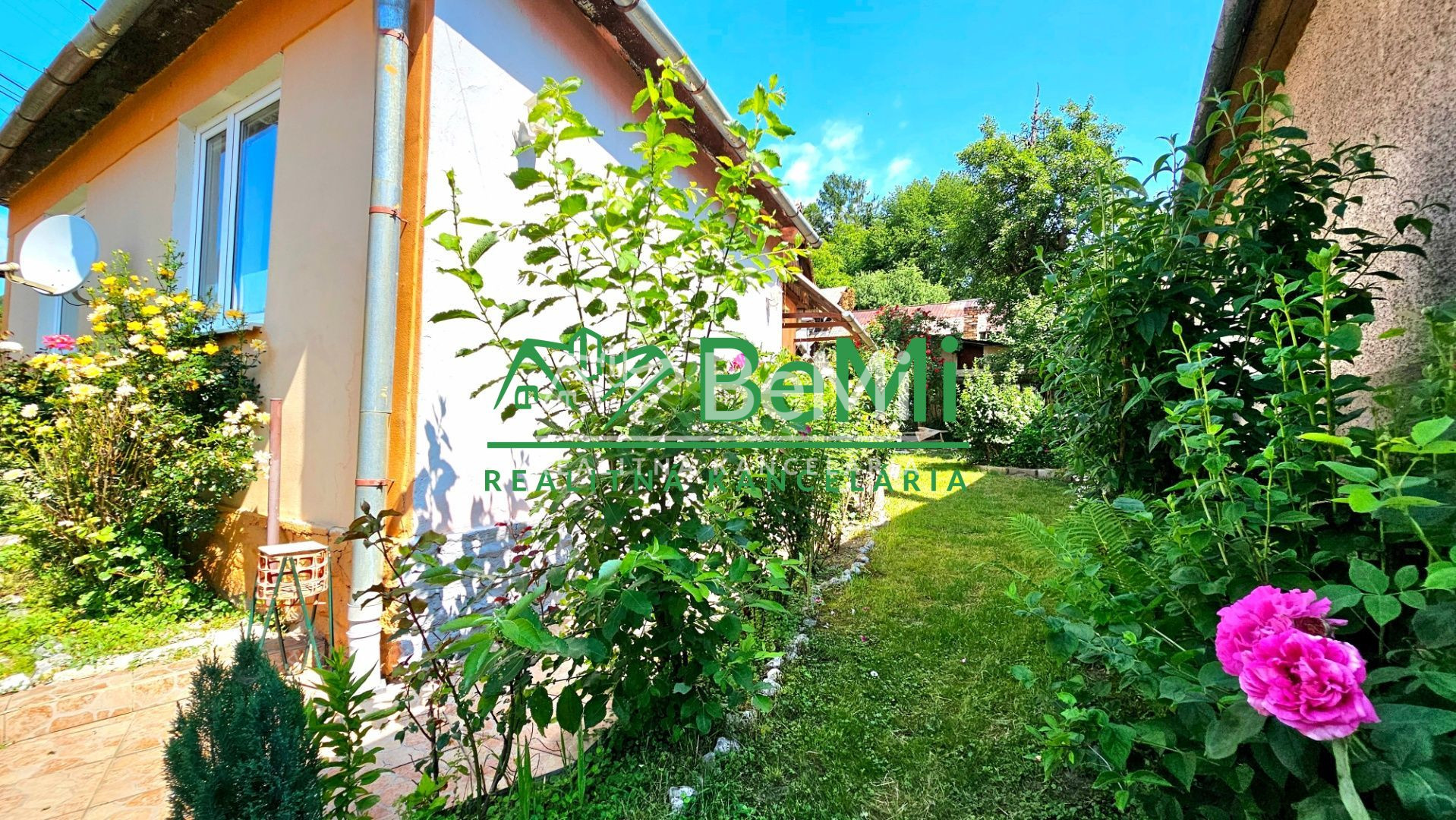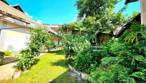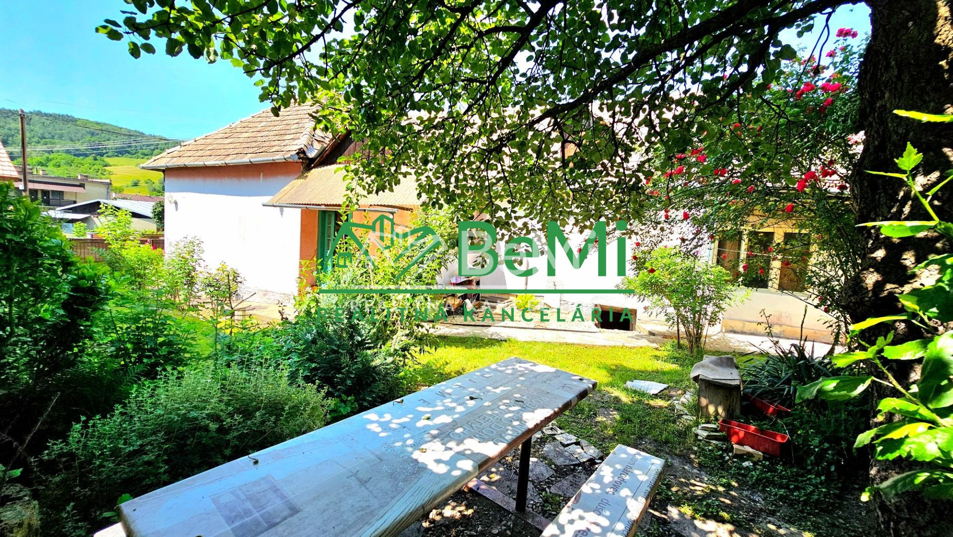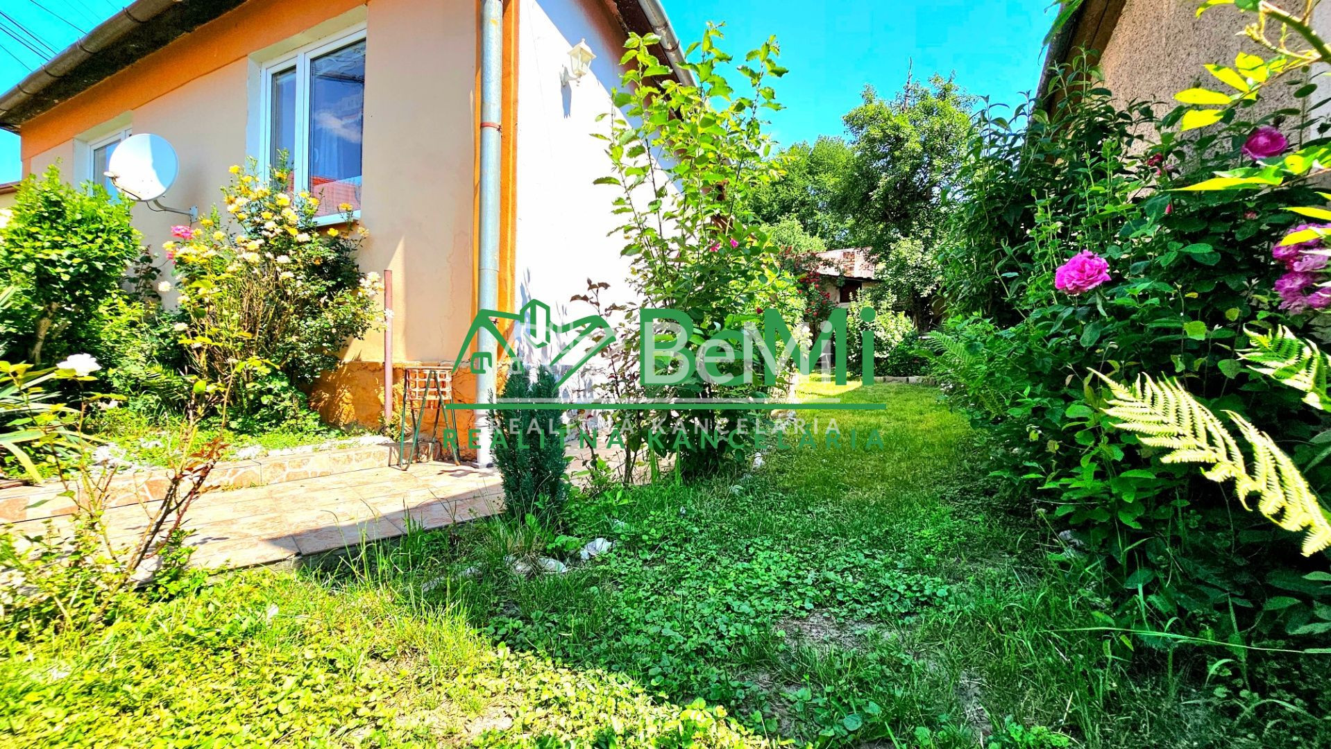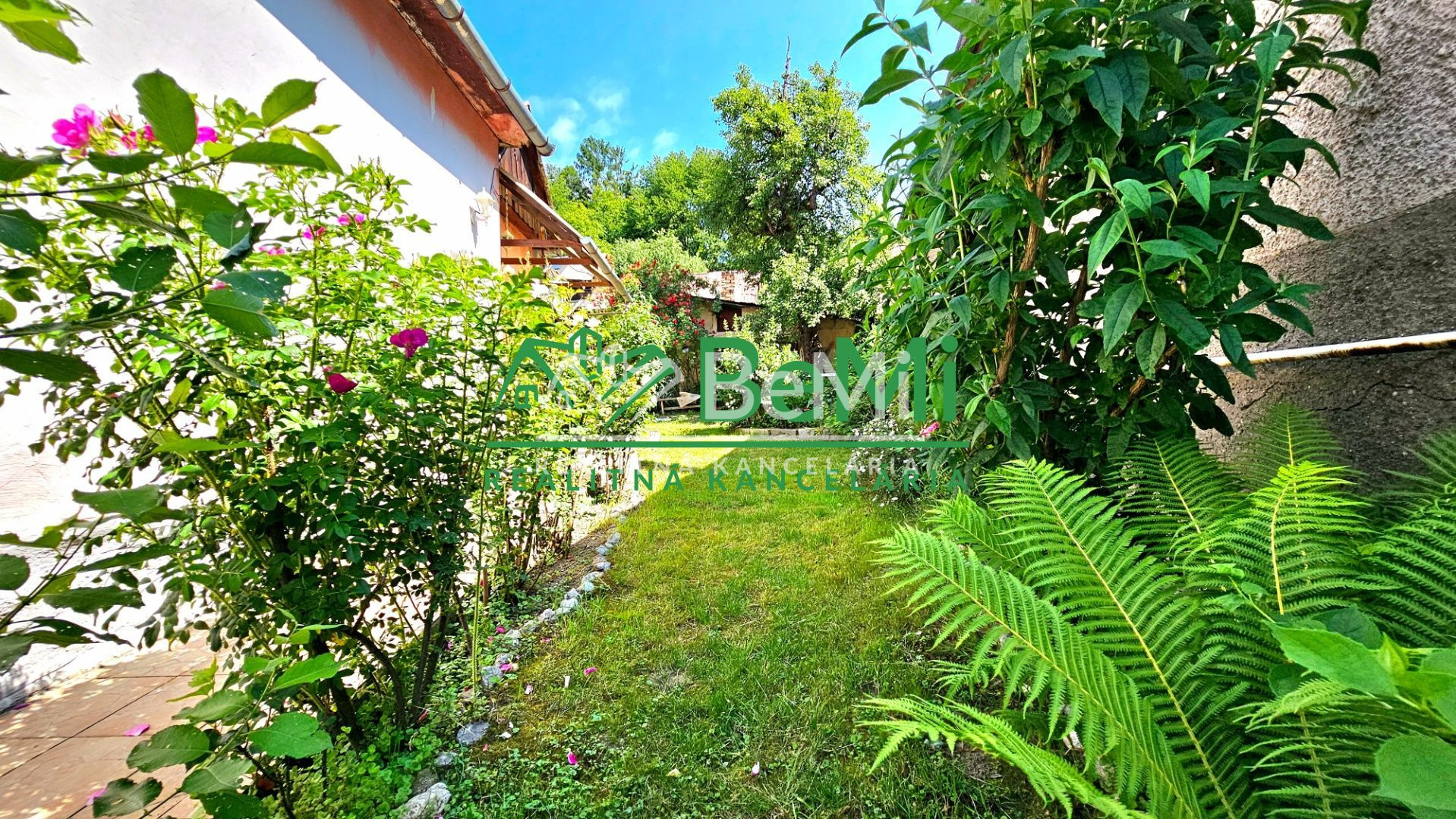 Nádvorie a predzáhradku domu tvoria okrasné rastliny a ovocný strom moruša.