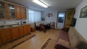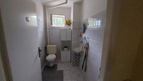 Dispozícia domu: prvé poschodie : chodba, priestranná kuchyňa, obývačka, 2 izby, kúpeľňa so sprchovým kútom a s WC, ďaľšie samostatné WC, 3 špajze.