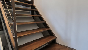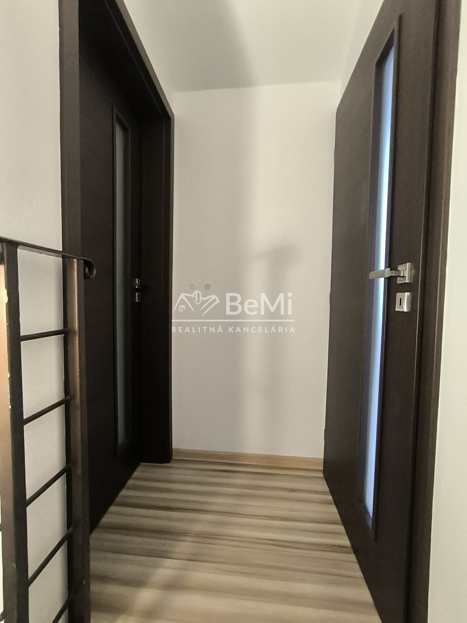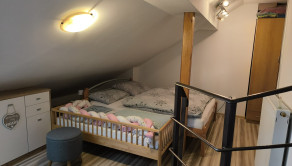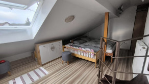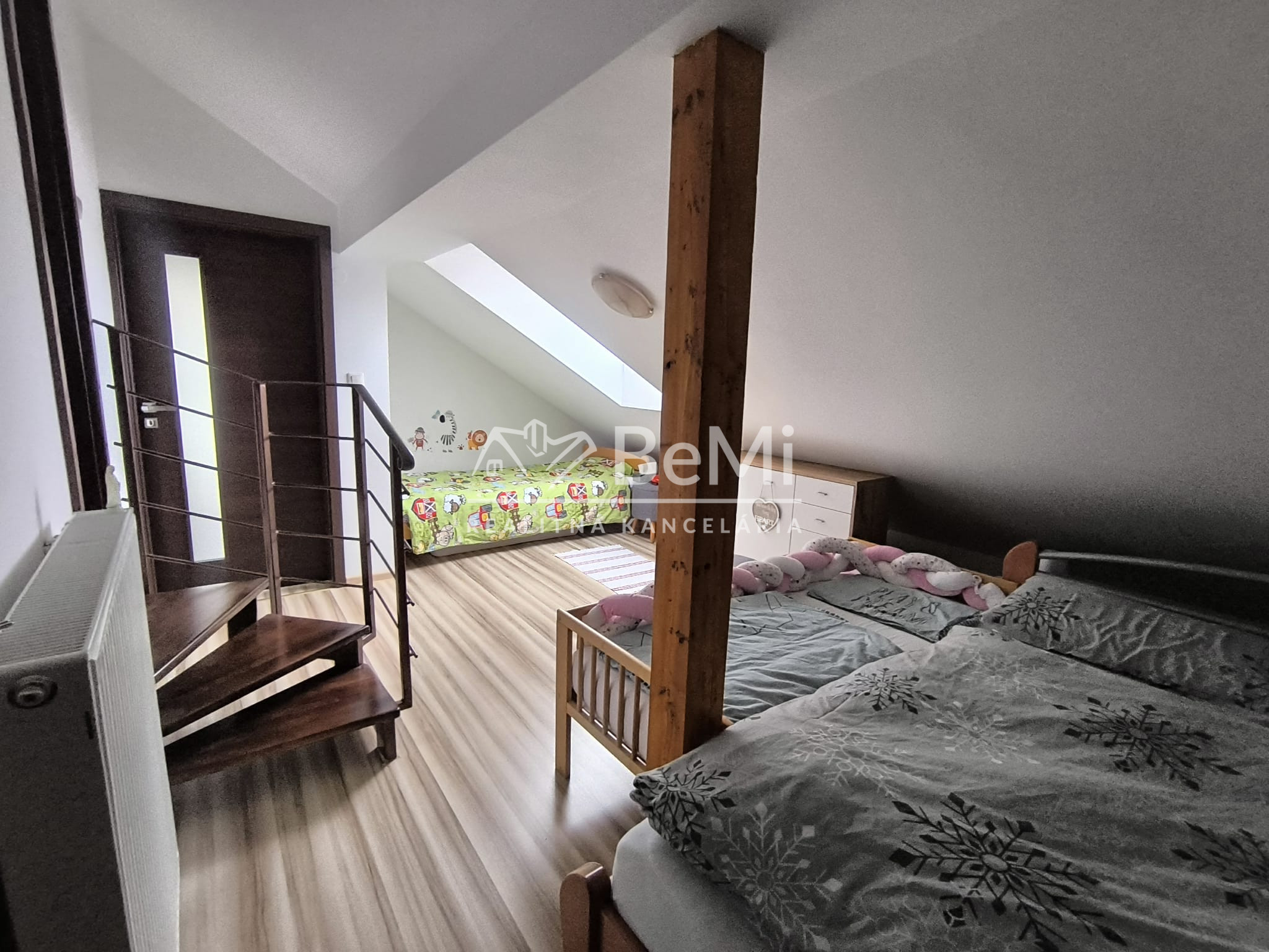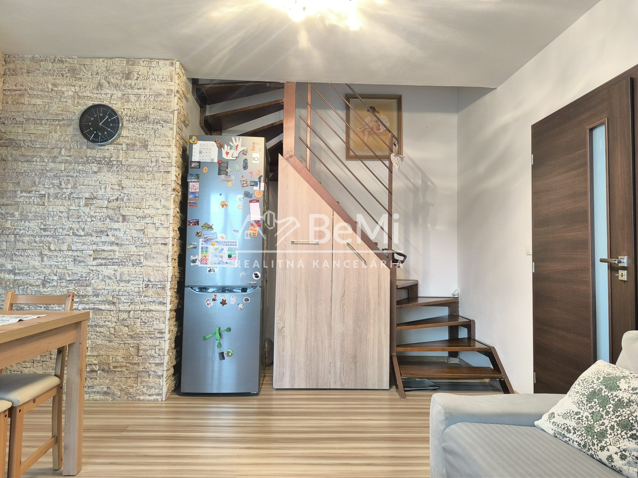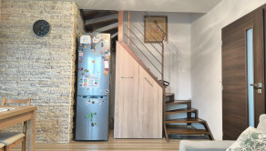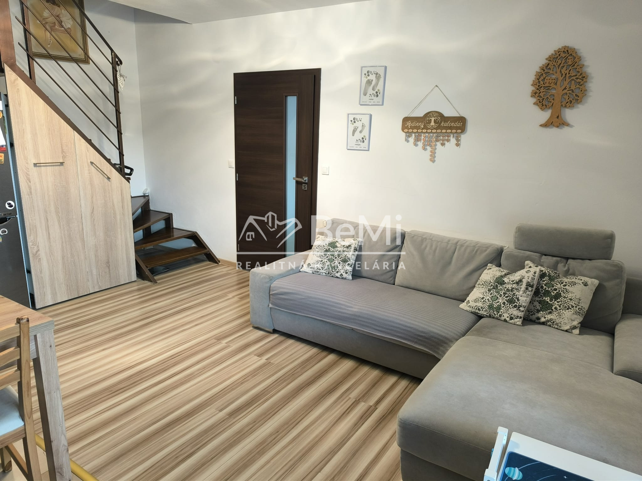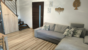 Dispozícia je veľmi praktická – jedna izba je na dennom podlaží pri kuchyni, ďalšie dve ponúkajú súkromie na poschodí. Byt pôsobí ako menší rodinný dom.