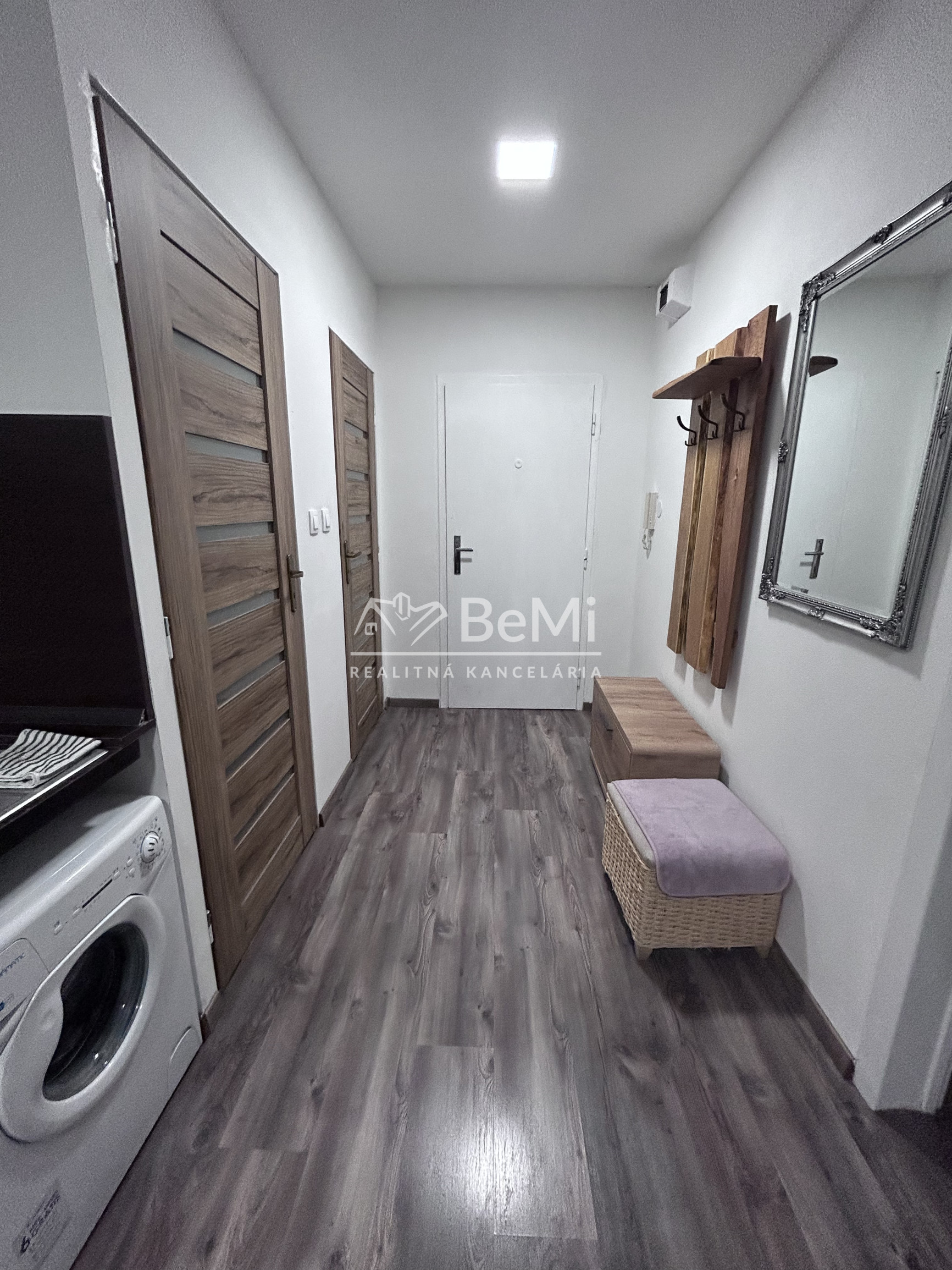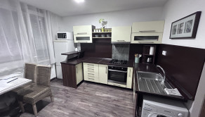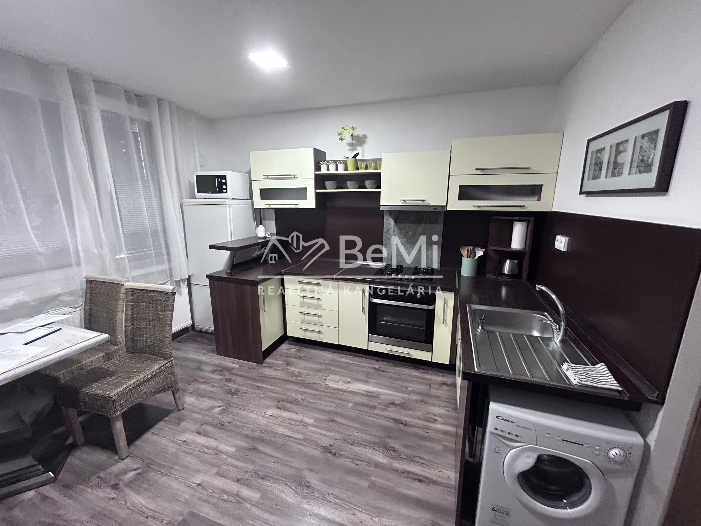 Vybavenie bytu: Kuchyňa s kuchynskou linkou, kombinovaným sporákom, mikrovlnkou, chladničkou,rýchlovarnou kanvicou, jedálenským sedením a jedálenskou komodou. Súčasťou kuchyne je aj pračka.