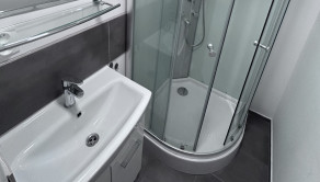 Kúpeľňa s masážnym sprchovým kútom, umývadlom.