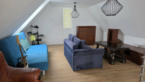 Poschodie ponúka priestrannú spálňu s balkónom, z ktorého sa naskytá nerušený výhľad na okolitú krajinu – ideálne miesto na rannú kávu či večerný pohár vína.