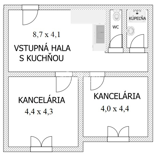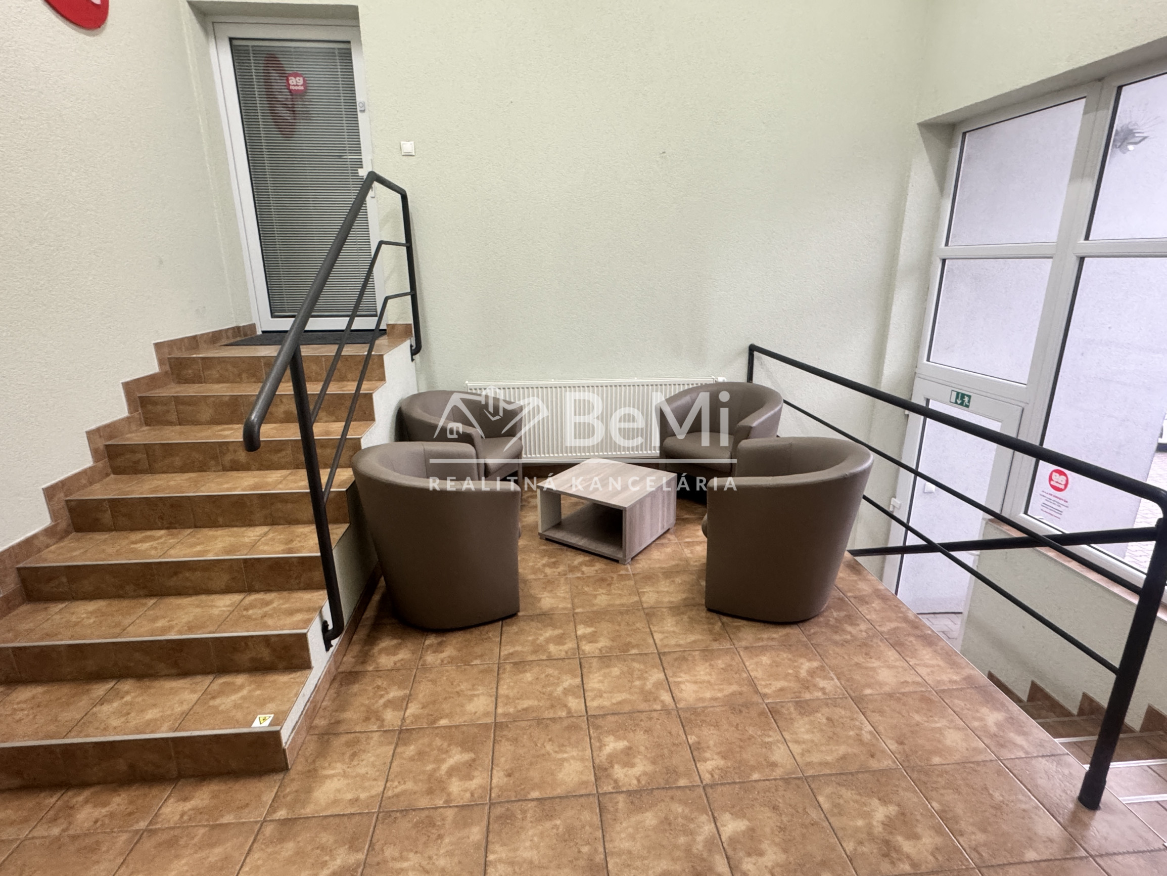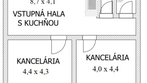 Priestory sú tvorené tromi miestnosťami. Vstupnou halou s kuchynkou a 2 samostatnými kanceláriami.