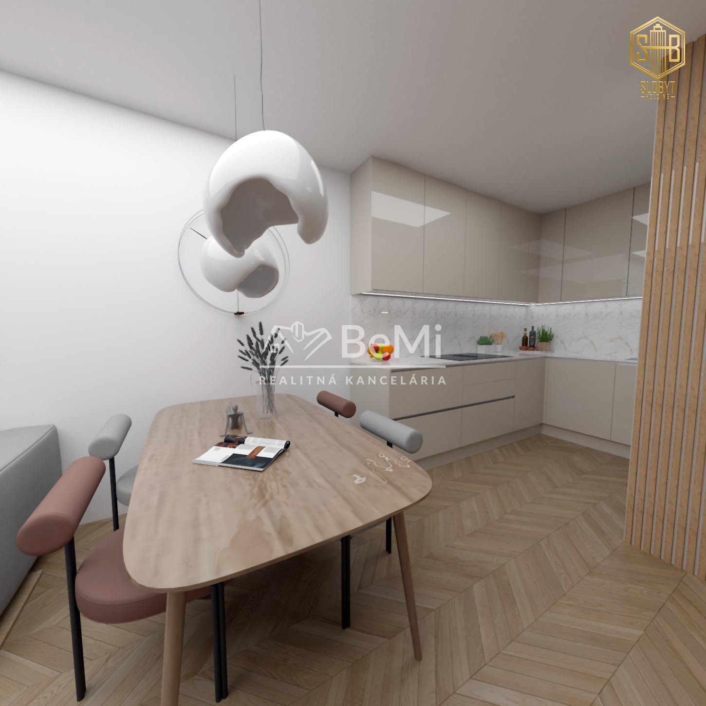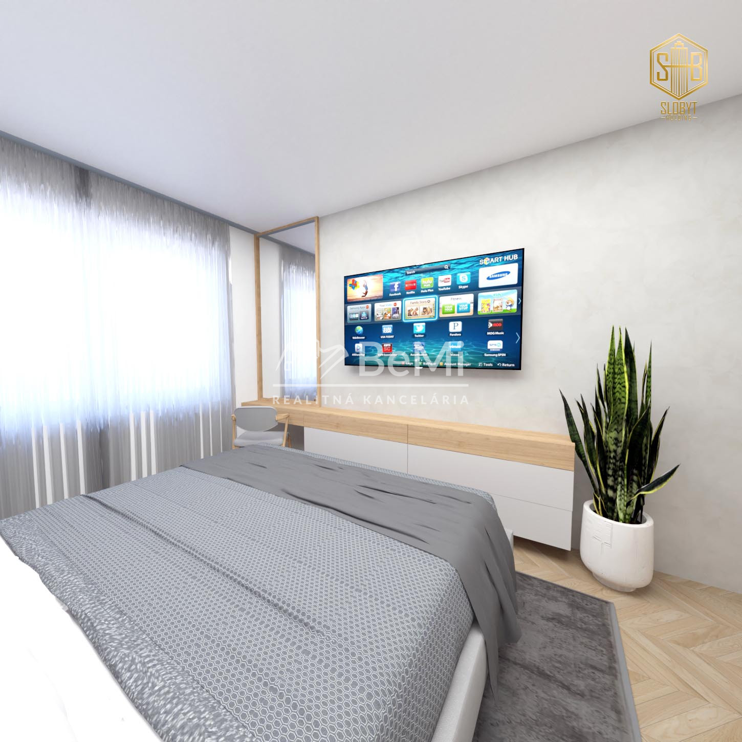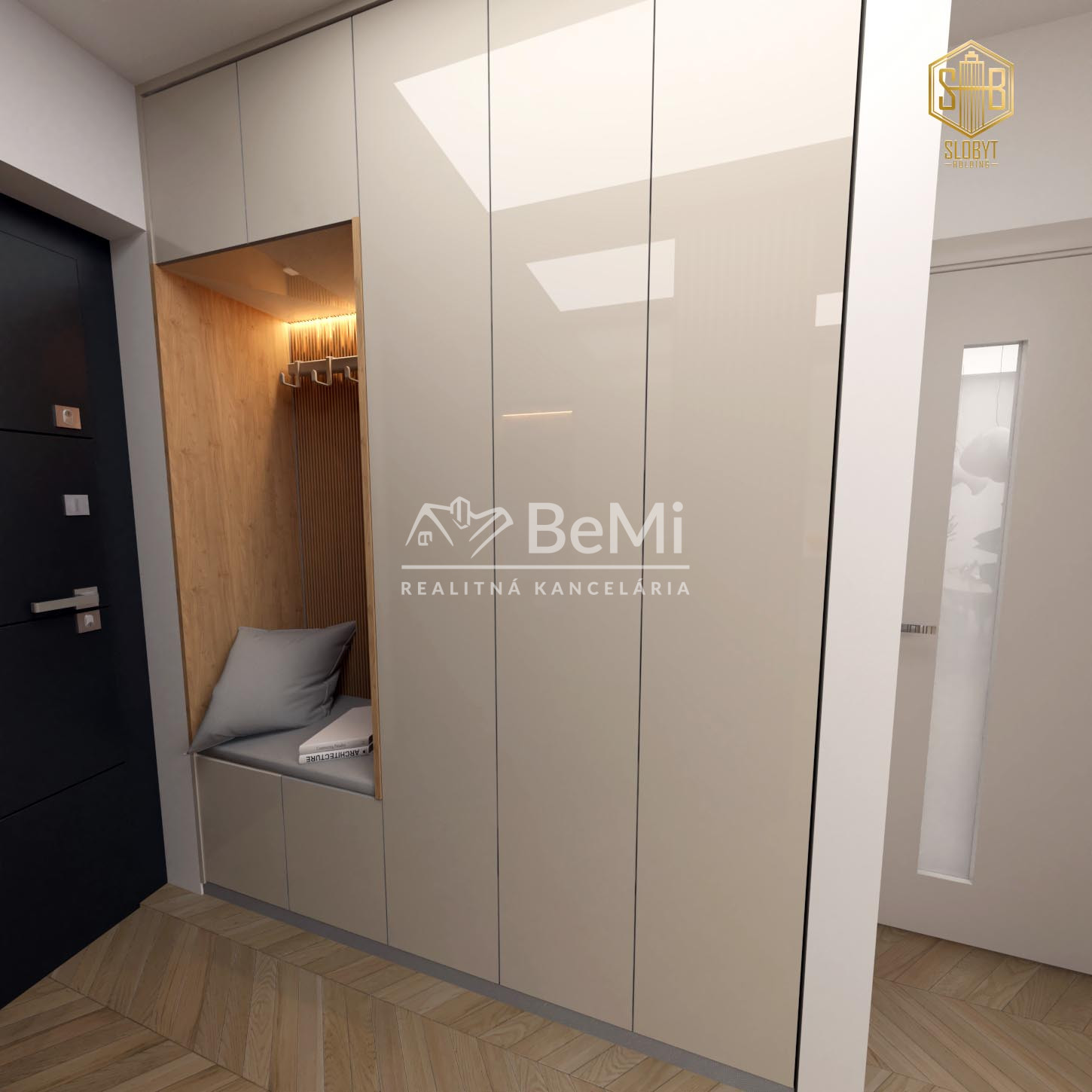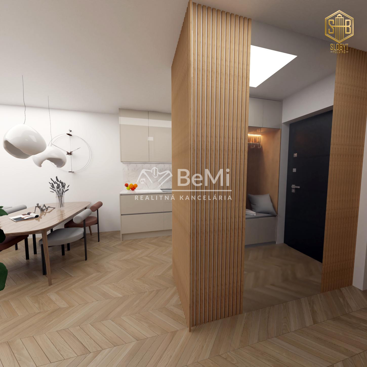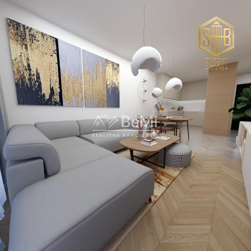 Apartmán v štádiu holobyt, stavebne dokončené steny, biely náter, vodné podlahové kúrenie s elektrickým kotlom, vstupné protipožiarne dvere, vypínače, elektrická predpríprava na svietidlá, loftové betónové stropy s priznanými prvkami, predpríprava kúpeľne vrátane Geberitu, predpríprava vonkajších žalúzií, celohliníkový balkón a kompletné realitné služby.