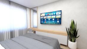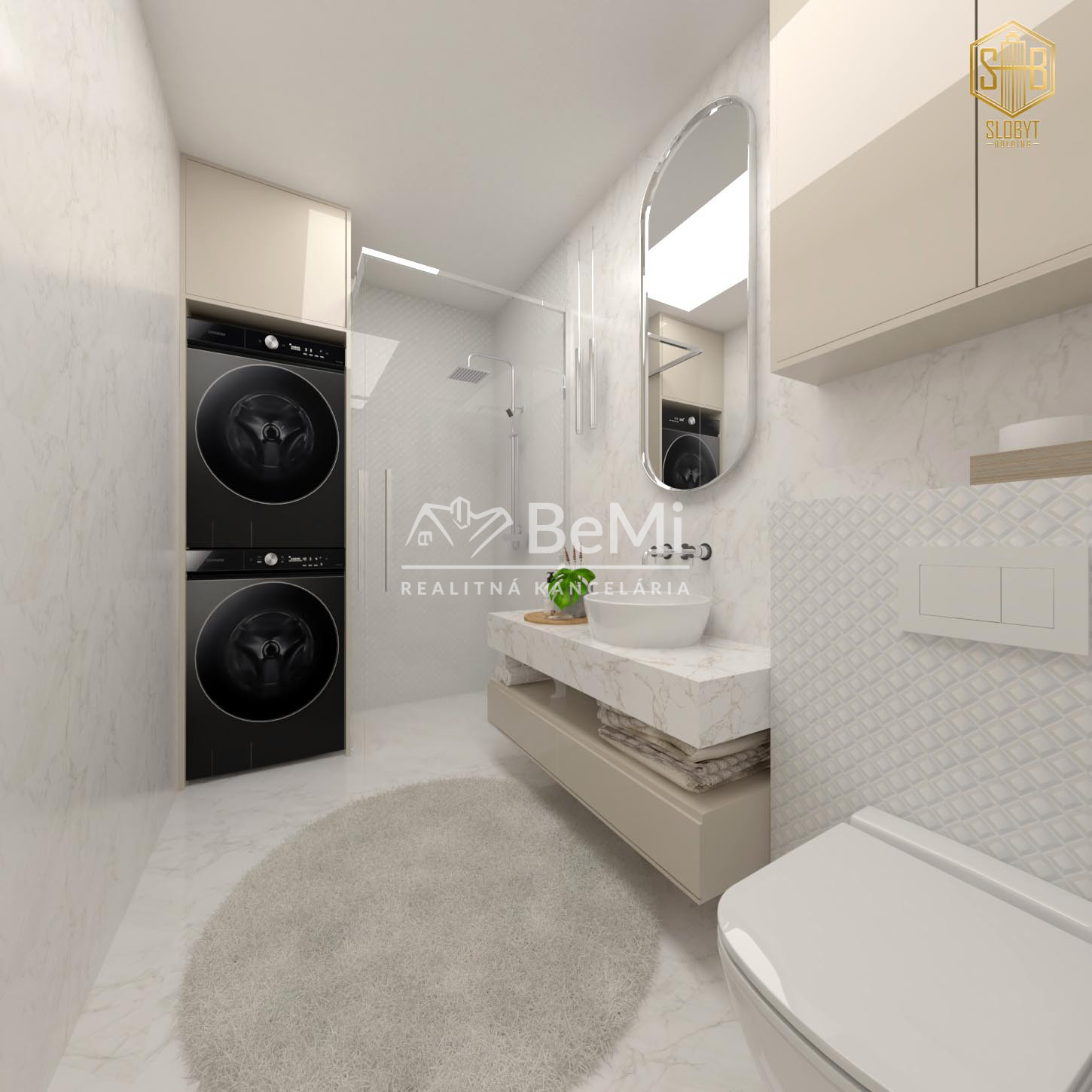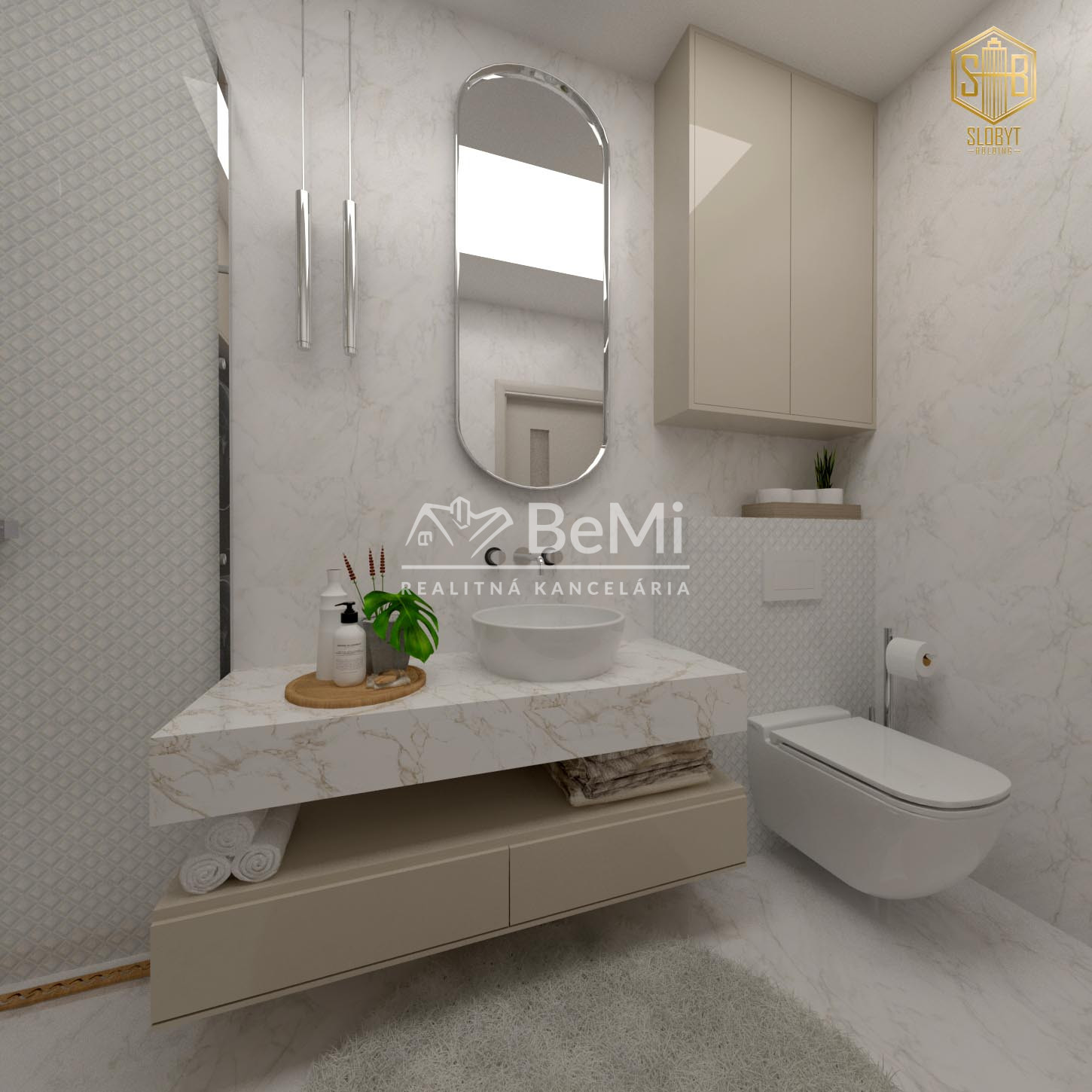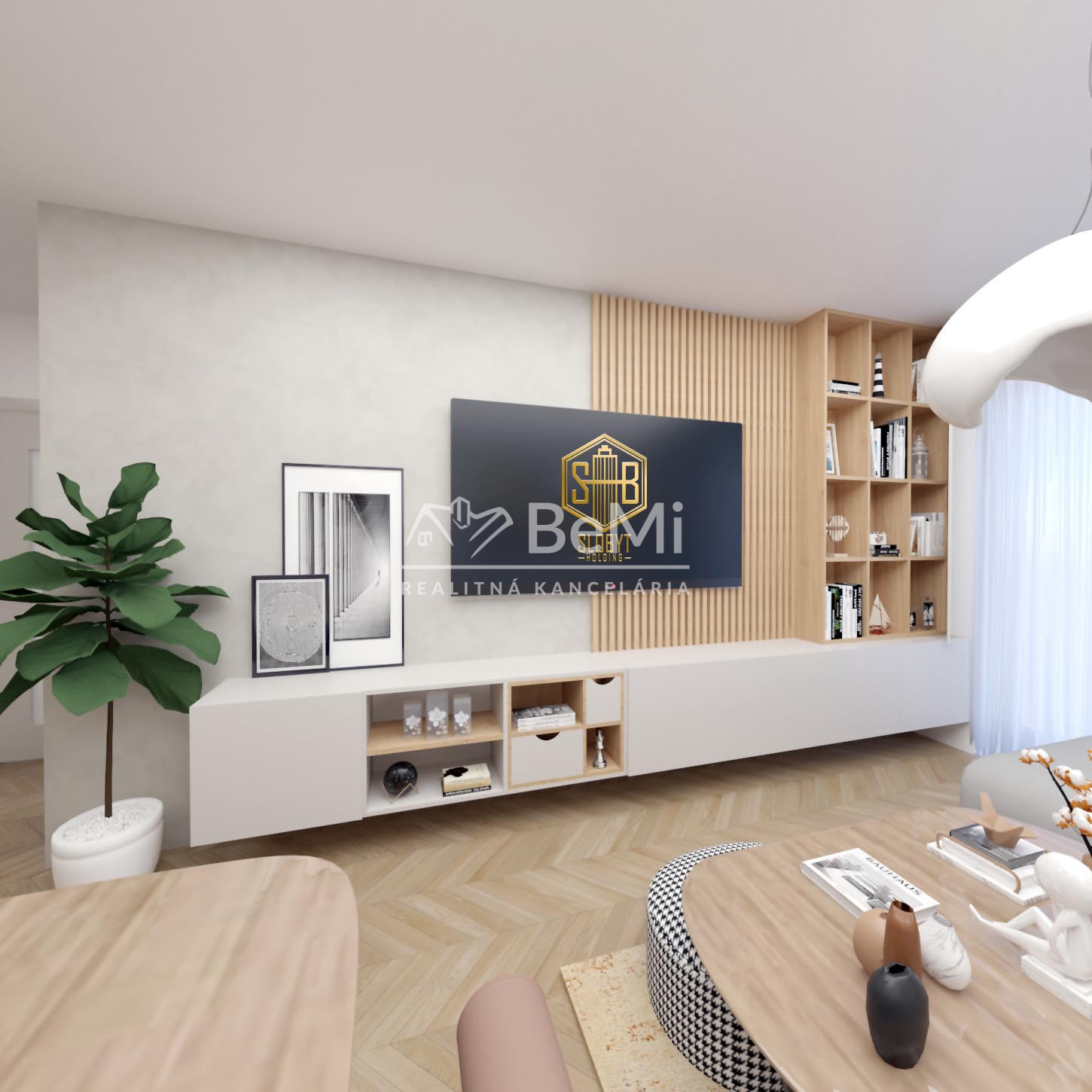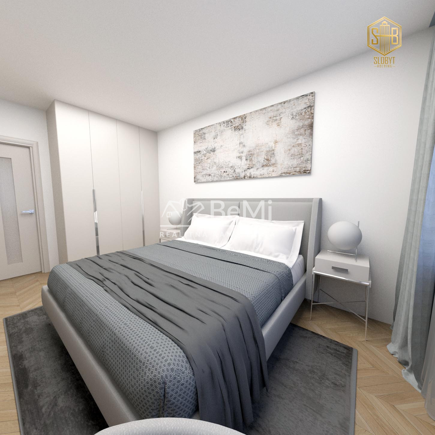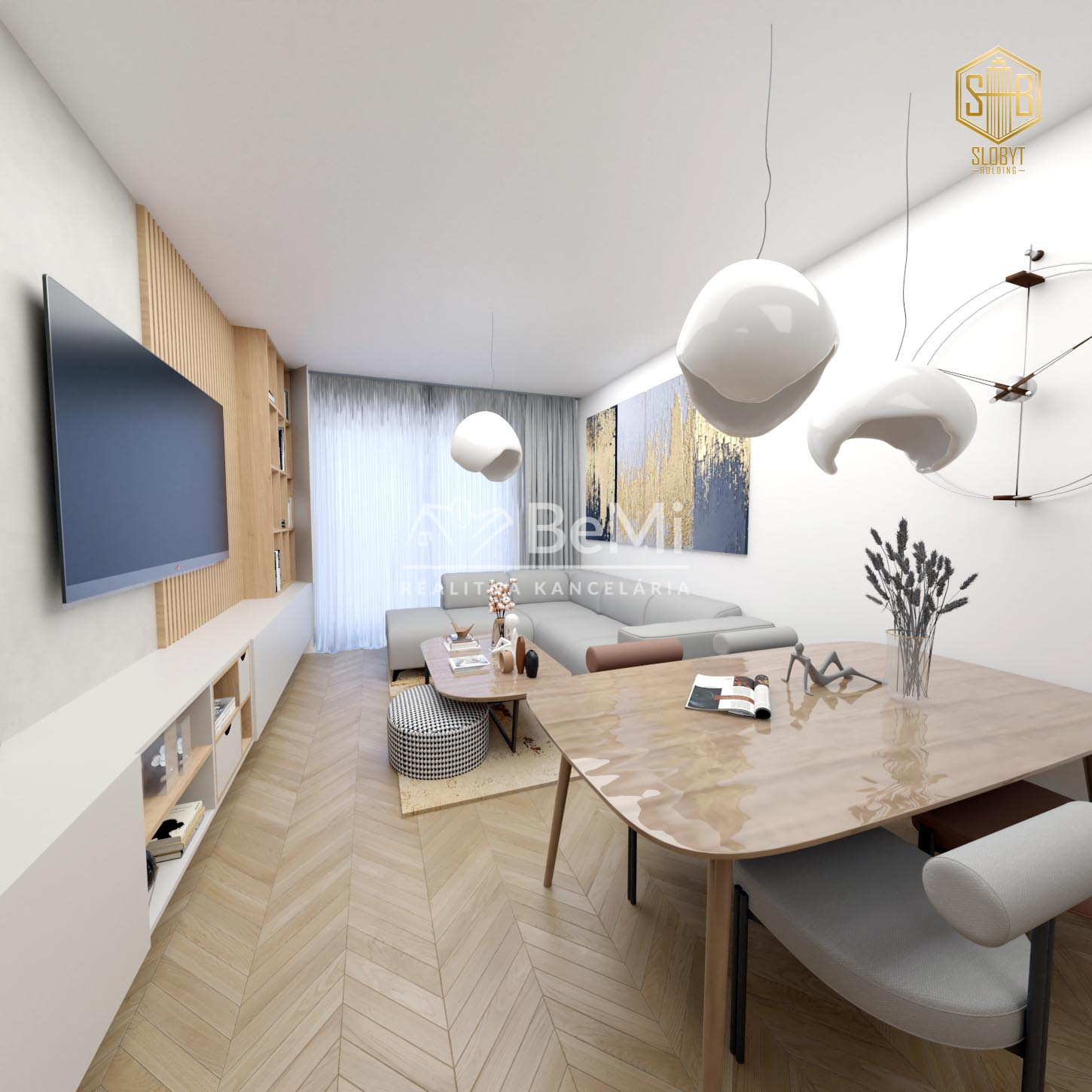Apartmán v štádiu holobyt, stavebne dokončené steny, biely náter, vodné podlahové kúrenie s elektrickým kotlom, vstupné protipožiarne dvere, vypínače, elektrická predpríprava na svietidlá, loftové betónové stropy s priznanými prvkami, predpríprava kúpeľne vrátane Geberitu, predpríprava vonkajších žalúzií, celohliníkový balkón a kompletné realitné služby.