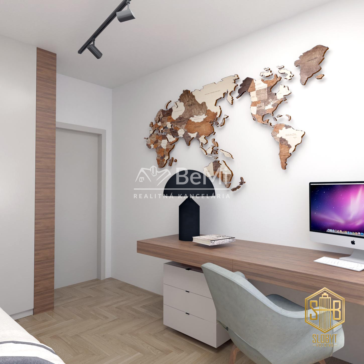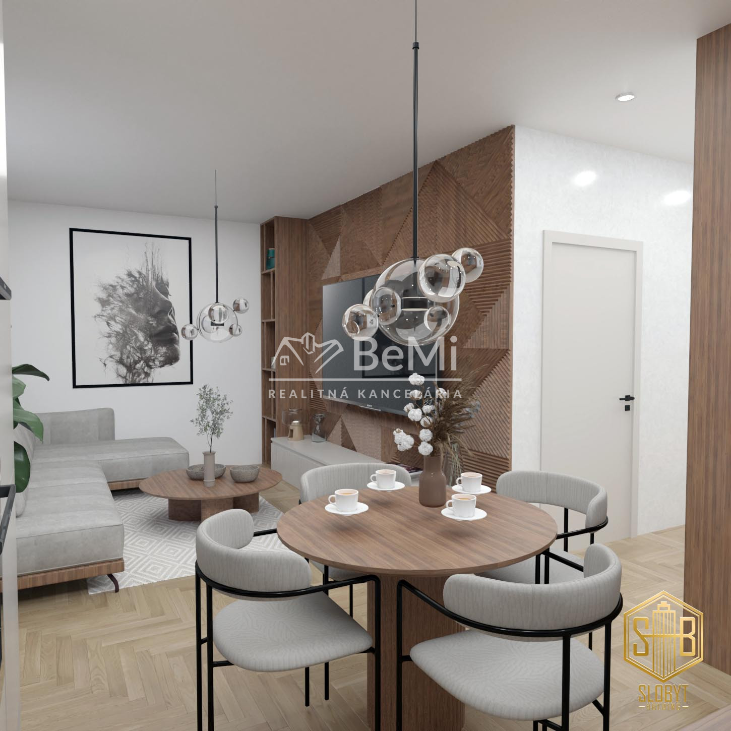 Apartmán v štádiu holobyt, stavebne dokončené steny, biely náter, vodné podlahové kúrenie s elektrickým kotlom, vstupné protipožiarne dvere, vypínače, elektrická predpríprava na svietidlá, loftové betónové stropy s priznanými prvkami, predpríprava kúpeľne vrátane Geberitu, predpríprava vonkajších žalúzií, celohliníkový balkón a kompletné realitné služby.