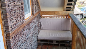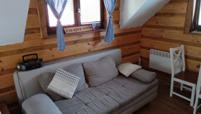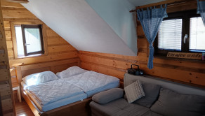 Nadzemná časť so vstupom cez drevené vonkajšie schodisko ponúka obývaciu časť, vybavenú vstupnou nadkrytou vonkajšou terasou s posedením, kuchynským kútikom s komodou, el. dvojplatničkou, dresom s batériou, mikrovlnou rúrou, chladničkou, dvojposteľou, sedacou súpravou, TV setom, stolom so stoličkami, kúpelňou so sprchovým kútom,umývadlom a WC.